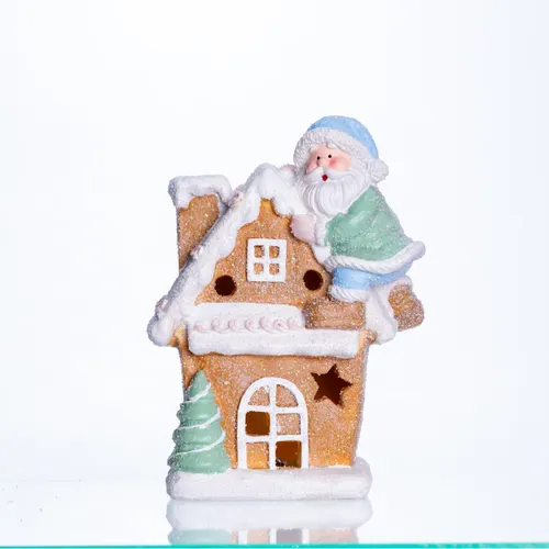 Новорічна декоративна фігурка представляє собою вишукану світну композицію, виконану з високоякісного фарфору. Головним елементом конструкції є фігурка пряникового будиночка з Санта-Клаусом, який зображений із детальною опрацюванням та виразною мімікою. Будиночок прикрашений білосніжним «снігом» та яскравими блискітками, що підсилює святковий настрій і наповнює інтер'єр атмосферою зимової казки.