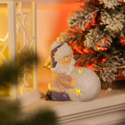 Особливість цієї новорічної фігурки — сніжний шар, який надає виробу особливу магію та святковий настрій. Легке сніжне напилення та м’яке світіння створюють приємний візуальний ефект, сприяючи створенню атмосфери зимової казки у вашому домі. Світловий елемент розміщений так, що освітлює фігурку м’яким світлом, не дратуючи очі.