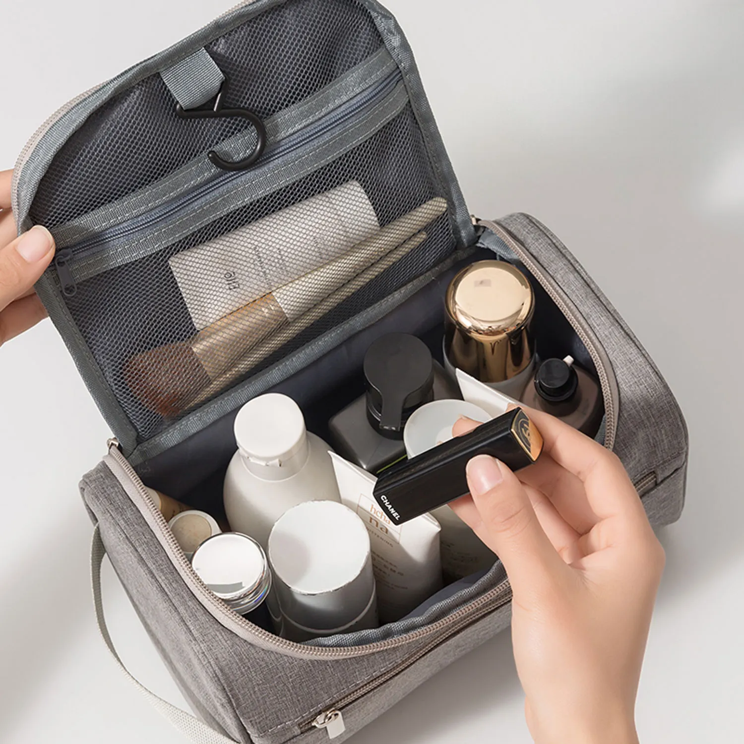 Косметичка підходить для розміщення в ручній поклажі. Основне відділення з жорстким дном зберігає форму та дозволяє розміщувати стандартні тюбики, шампуні та дезодоранти. Додаткові сітчасті та прозорі кишені на блискавці, зовнішня кишеня та вбудований гачок для підвішування забезпечують максимальну функціональність та зручність використання.