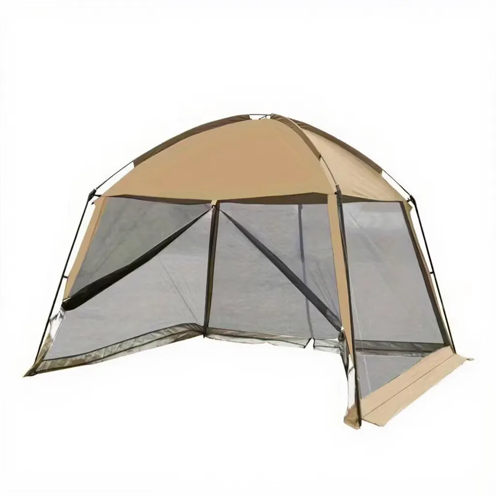Легке та просторе шатро-намет з чотирма сітчастими стінками, двома входами на блискавці та водовідштовхувальним тентом з поліестеру. Ідеальний для пікніків, відпочинку на дачі, пляжу та кемпінгу – захищає від комах, створює прохолодну тінь та забезпечує огляд навколо. Переваги Захист від комах та вітру при збереженні вільної вентиляції завдяки сітчастим стінкам. Два входи на блискавці забезпечують зручний прохід. Поліестеровий тент захищає від легкого дощу та сонця; матеріал легко очищується. Легкий каркас забезпечує мобільність та швидку установку. Підходить для сімейних пікніків, відпочинку з дітьми та приготування їжі на відкритому повітрі. Догляд та зберігання Очищайте поверхню вологою тканиною; при сильних забрудненнях використовуйте м'яке мило. Не зберігайте у сирому вигляді – повністю висушіть перед упаковкою, щоб уникнути цвілі. При сильному вітрі або штормі рекомендується демонтувати та нести конструкцію в укриття. Слідкуйте за цілісністю швів та блискавок; при необхідності змащуйте бігунки воском або силіконовим спреєм. Характеристики Матеріал тенту: Оксфорд 210T Матеріал каркасу: алюміній Розмір: 3*3 м