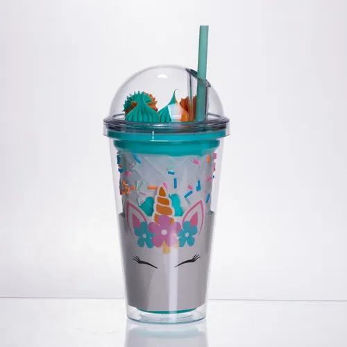 Пластиковий стакан об'ємом 400 мл представляє собою практичний і стильний аксесуар, який ідеально підходить для використання як удома, так і в подорожах. Яскравий бірюзовий колір та оригінальний декор із зображенням єдинорога роблять його привабливим вибором для дітей та дорослих, які цінують зручність і естетику.
