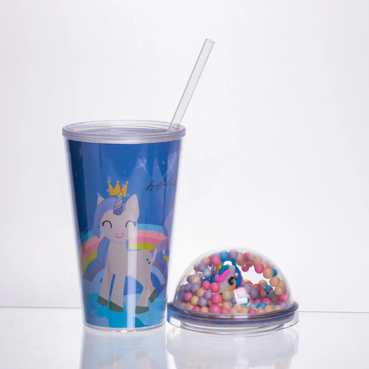 Подвійні стінки пластикового стакана не лише створюють декоративний ефект, зберігаючи яскраві кольори та малюнок із зображенням єдинорога, а й виконують функцію теплоізоляції. Така конструкція перешкоджає утворенню конденсату на зовнішній поверхні, що робить користування комфортнішим, не допускає намокання рук і ковзання у долоні.
