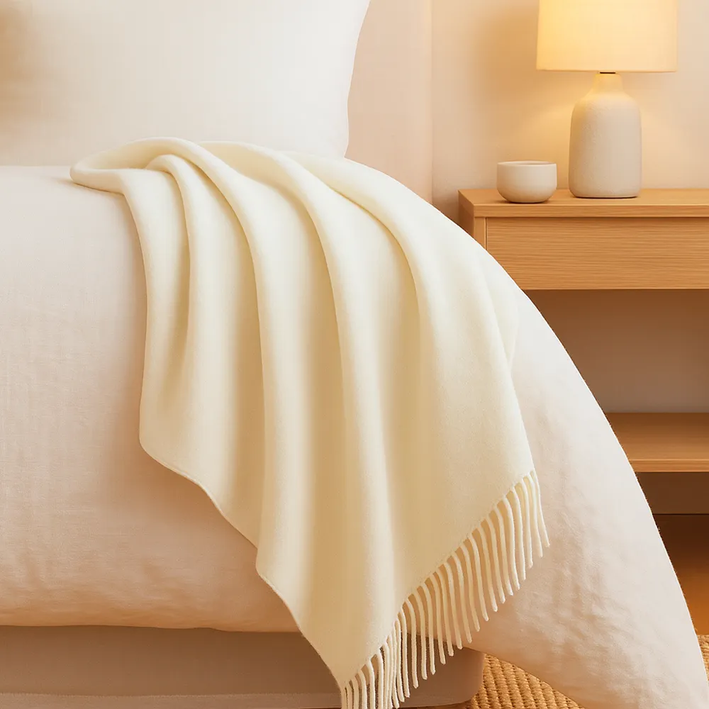Для виготовлення цього пледа використовується овеча вовна — високоякісний натуральний матеріал, відомий своїми теплоізоляційними властивостями. Щільність 380 г/м2 забезпечує оптимальне тепло, дозволяючи виробу зберігати тепло навіть у прохолодну погоду. Натуральна вовна пропускає повітря, запобігаючи перегріванню та створюючи комфортні умови для шкіри.