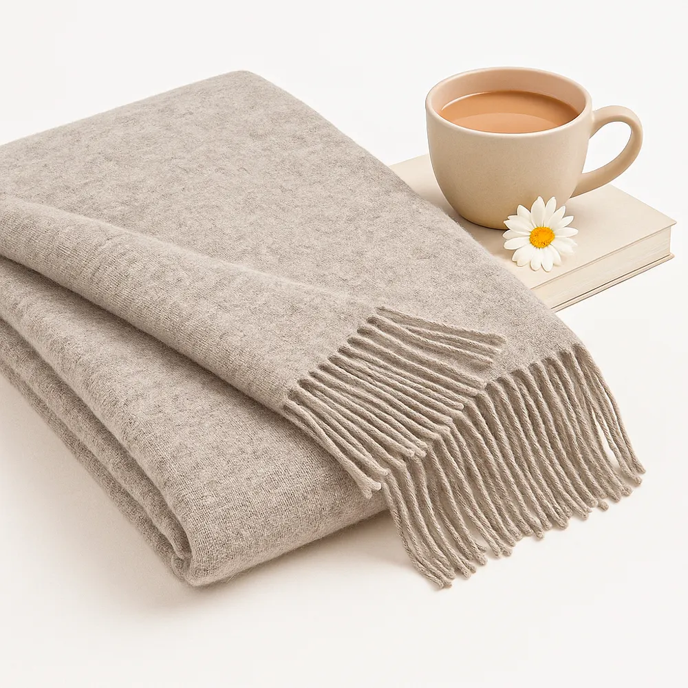 Для збереження якості пледа рекомендується делікатне прання у холодній воді з використанням спеціальних засобів для шерсті або хімчистка. Уникайте машинного сушіння та агресивних миючих засобів, щоб ворс зберігав свою м'якість і структуру.