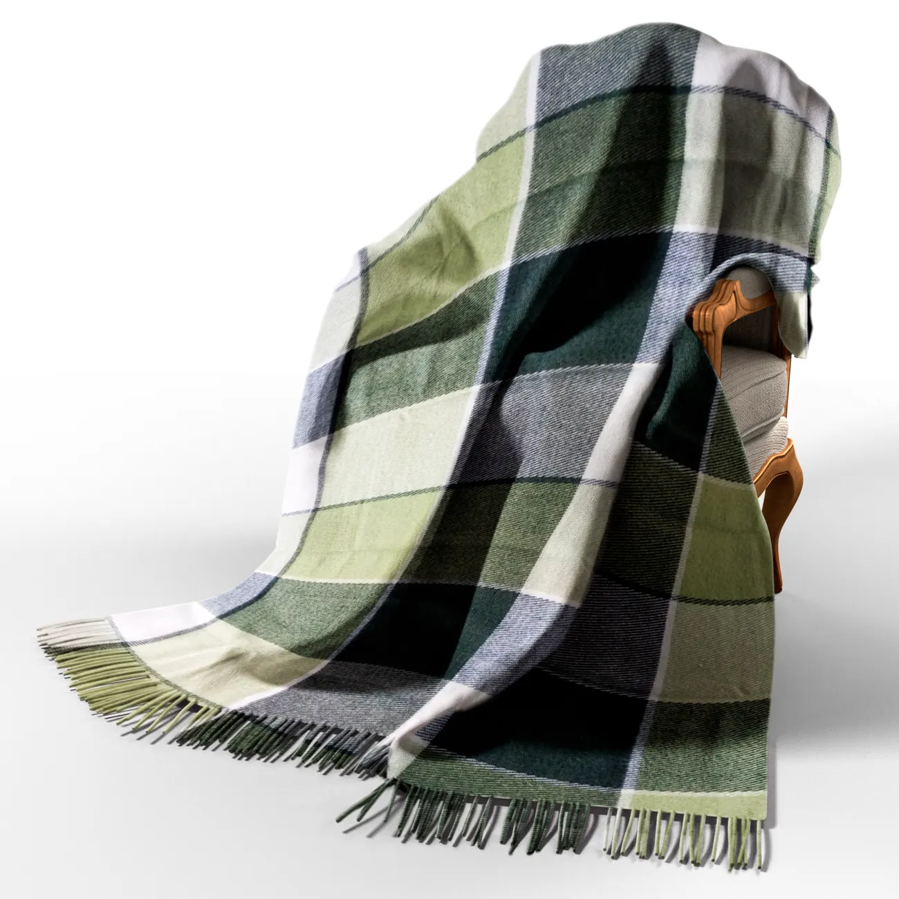 Склад пледа: 70% овеча вовна та 30% поліестер, що забезпечує оптимальний баланс м'якості та довговічності. Вовна відома своїми термоізоляційними властивостями, а поліестер додає міцності виробу. Плед виконаний у класичну шотландську клітину, що доповнюється бахромою, яка включена до загального розміру виробу.