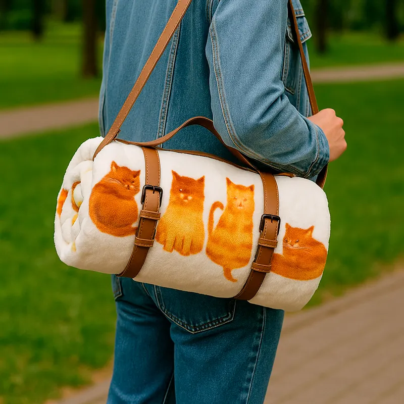 Плед комплектується ременем із штучної шкіри з регульованими застібками, що дозволяє компактно скручувати виріб і зручно переносити його під час прогулянок чи виїздів. Легка вага і невеликий об’єм після складання роблять плед оптимальним для дорожнього набору.