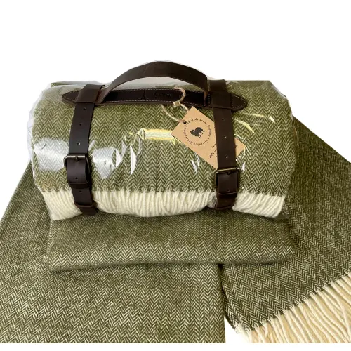 Плед тревел шерсть 100% 140х200 олива с ремнем Love You