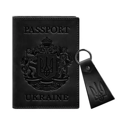 У комплект входять два основні елементи: шкіряна палітурка для паспорта розміром 13,5 на 10 сантиметрів та брелок з українською символікою. Палітурка виконана в чорному кольорі і прикрашена тисненням герба України, що надає йому унікального зовнішнього вигляду.