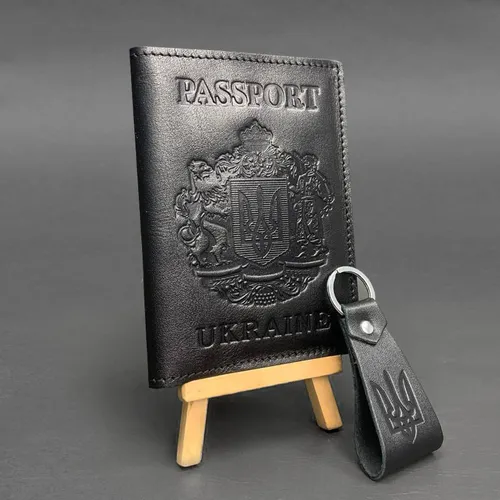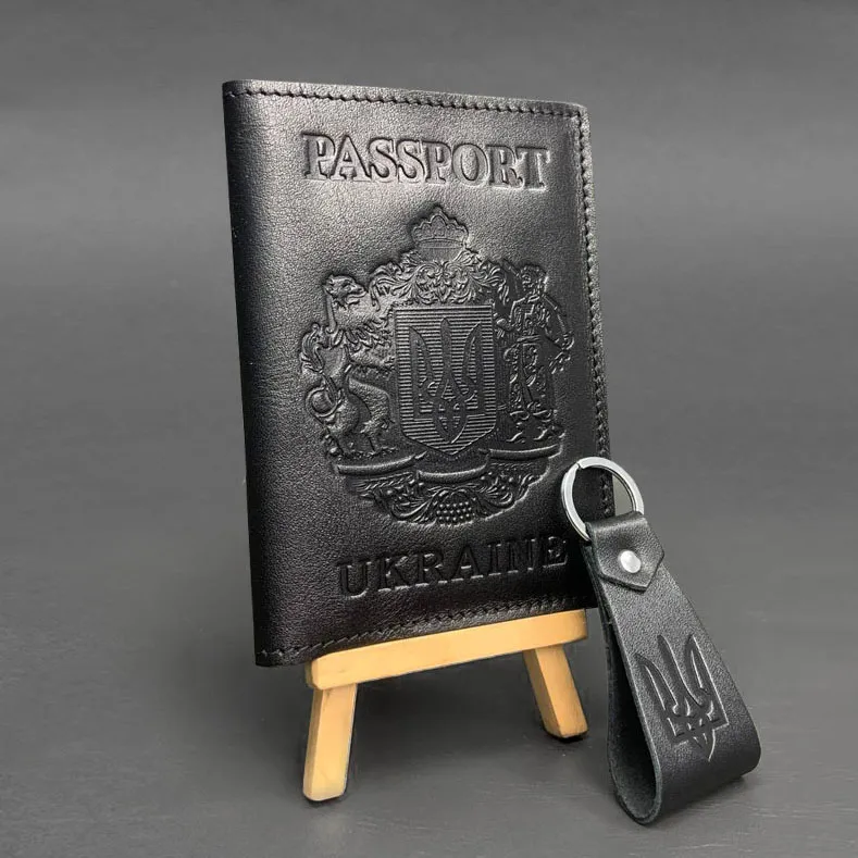 Кожен елемент набору продуманий до дрібниць. Шкіряна палітурка для паспорта чорного кольору прикрашена тисненням із зображенням українського герба, що підкреслює патріотичний дух аксесуара. На додаток йде брелок з гербом України, виконаний у тому ж стилі та кольоровій гамі, що дозволяє зберегти єдність дизайну та використовувати набір у повсякденному житті.