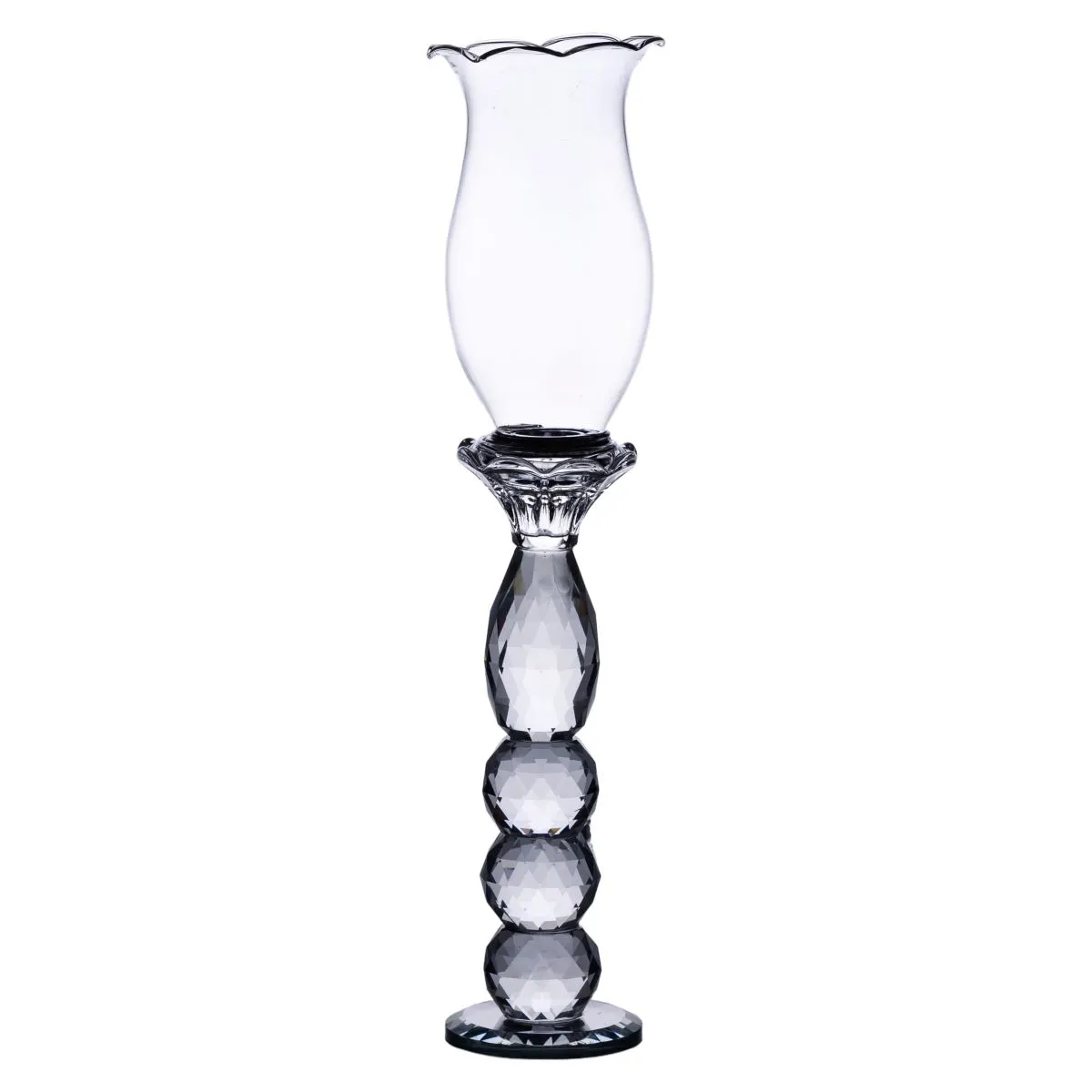Підсвічник виготовлений із прозорого якісного скла, що забезпечує йому легкість і вишуканість. Його високе циліндричне тіло з хвилястим краєм у верхній частині нагадує пелюстки квітки і м'яко розсіює світло свічки. Стійка ніжка складається з двох скляних сфер, плавно переходящих у кругле підставу діаметром 7 см, що гарантує надійність розташування на поверхні.