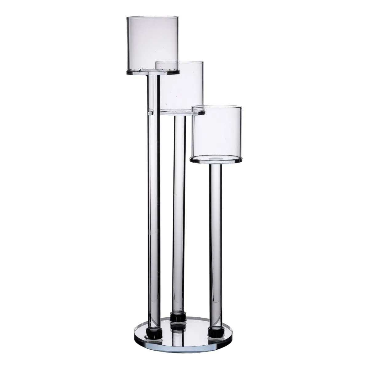 Підсвічник скляний на 3 свічки 12×37,5 см являє собою сучасний і стильний елемент інтер’єру. Його елегантна триступенева конструкція включає прозорі циліндричні тримачі, розташовані на різних висотах, що створює об’ємний і динамічний візуальний ефект. Дзеркальна основа підсилює блиск виробу та підкреслює чистоту ліній, роблячи підсвічник помітним акцентом у будь-якому приміщенні.