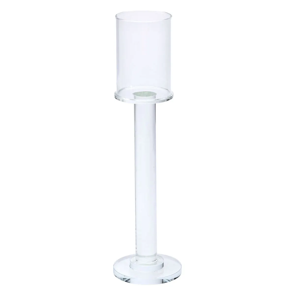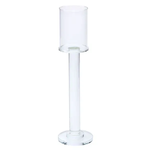 Цей скляний підсвічник на ніжці, висотою 31 см і діаметром 8 см, виготовлений із прозорого скла. Його лаконічна та витончена форма з чіткими гранями основи надає виробу шляхетного вигляду і підкреслює інтер'єр будь-яким стилем — від сучасного до класичного та арт-деко. Підсвічник розрахований на одну свічку діаметром близько 5.8 см, придатну для чайних або довгих конусоподібних і циліндричних свічок.