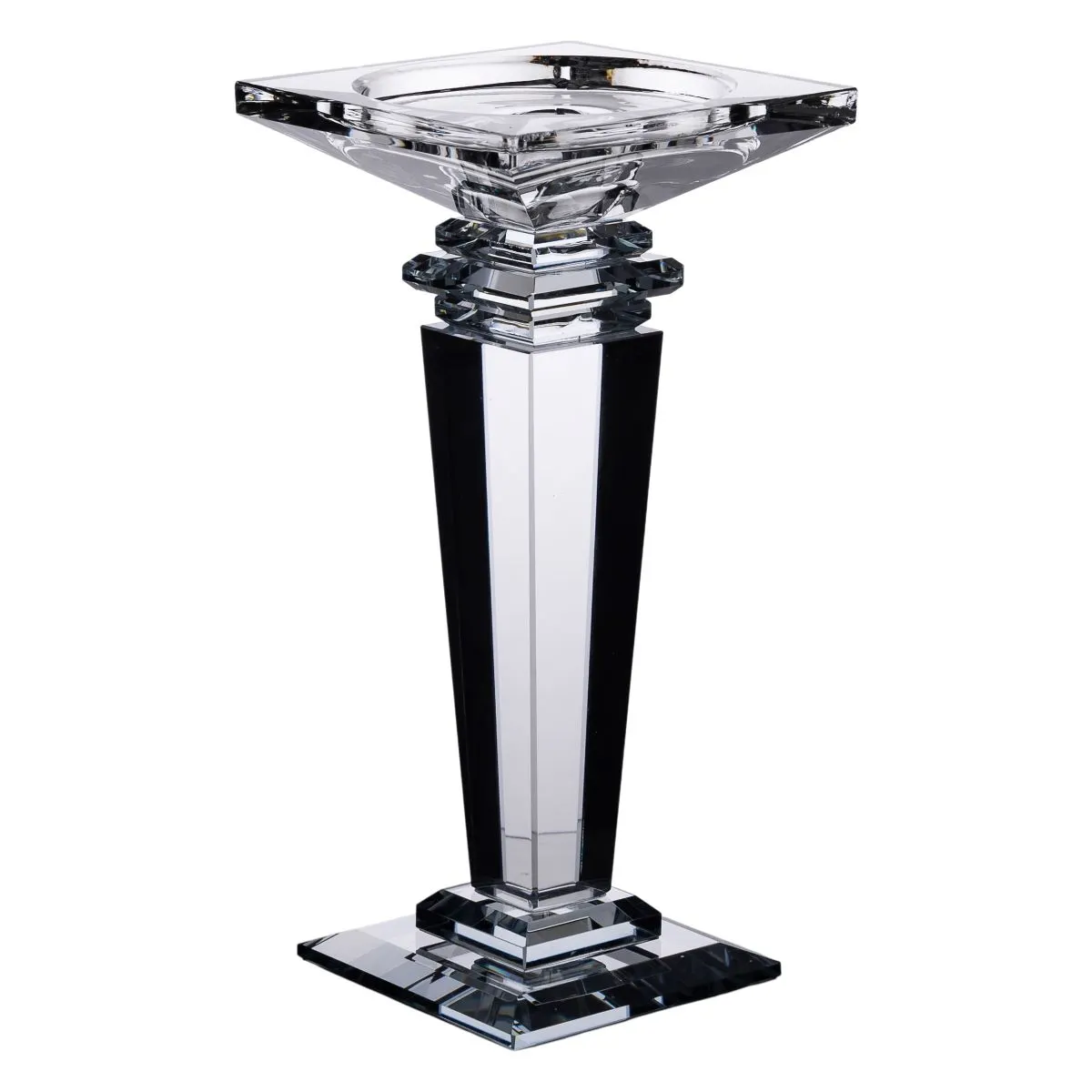 Декоративний підсвічник виготовлений із прозорого скла спеціальної обробки, що забезпечує міцність і яскравий блиск. Його розміри 9.5×9.5×20 см роблять виріб компактним, але водночас помітним елементом інтер’єру. Висока ніжка з гранями надає підсвічнику архітектурний вигляд, нагадуючи колони класичних споруд і створюючи відчуття вишуканості та строгості форм.