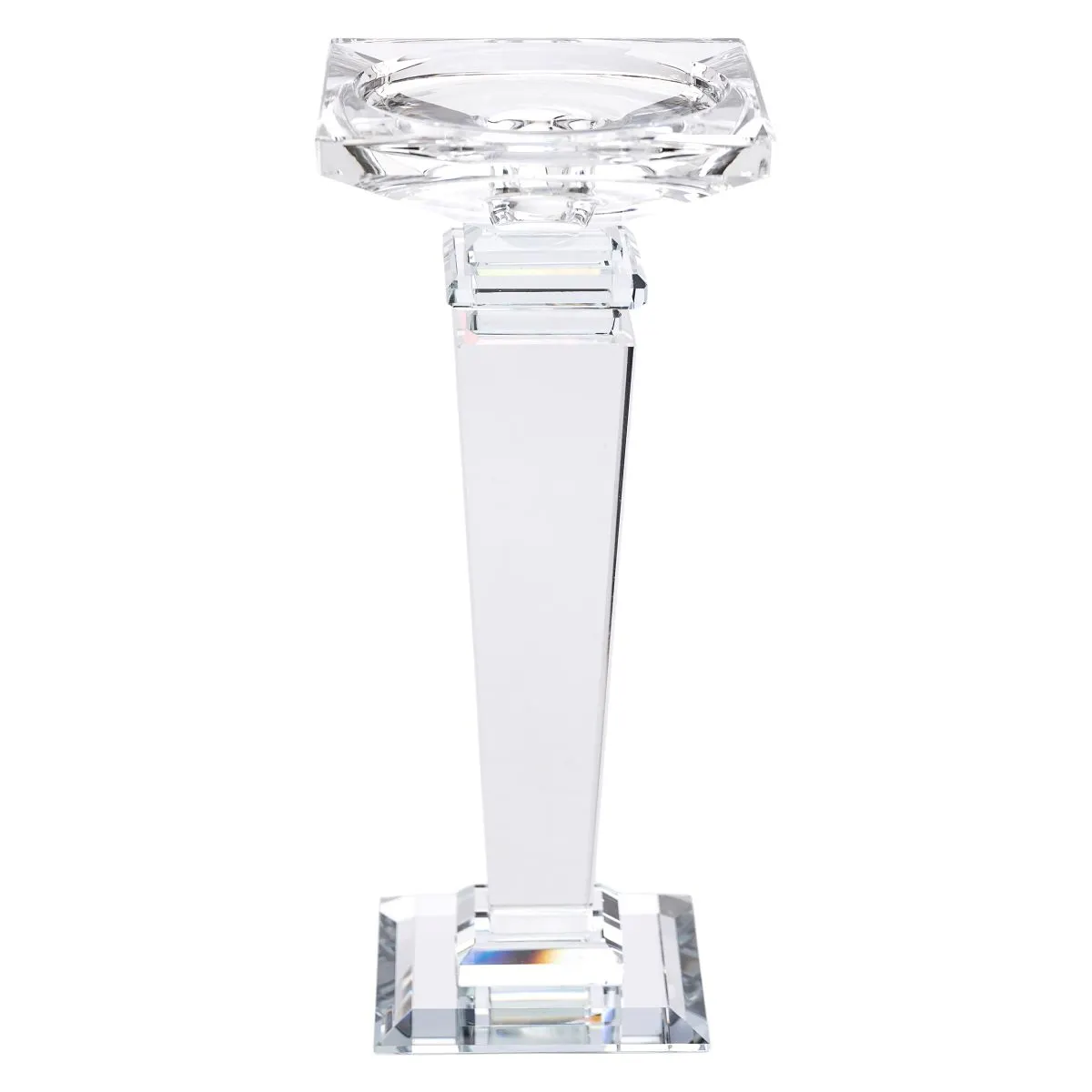 Декоративний підсвічник виготовлений з якісного прозорого скла, що надає йому легкості та елегантності. Висока ніжка висотою 22,5 см з чіткими гранями нагадує архітектурну колону та забезпечує стійкість виробу. Квадратна чаша розміром 9,5×9,5 см надійно фіксує свічку діаметром до 2,5 см, що дозволяє використовувати стандартні чайні або декоративні свічки.