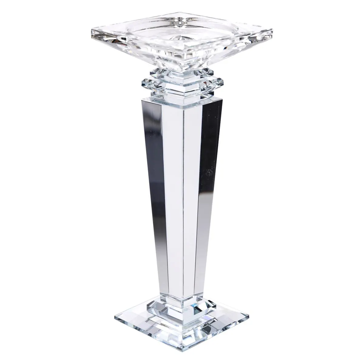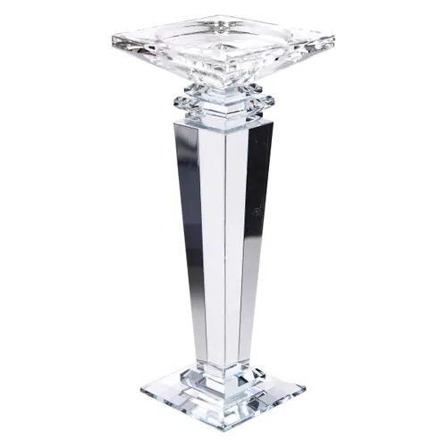Цей декоративний підсвічник виготовлений із прозорого скла і має строгий геометричний вигляд, що надає виробу сучасного та елегантного вигляду. Висока ніжка з гранчастою структурою нагадує архітектурну колону, підкреслюючи стильову витриманість виробу. Квадратна чаша для свічки масивна і одночасно прозора, що робить підсвічник ефектним елементом декору.