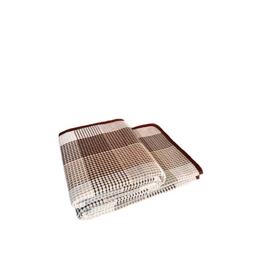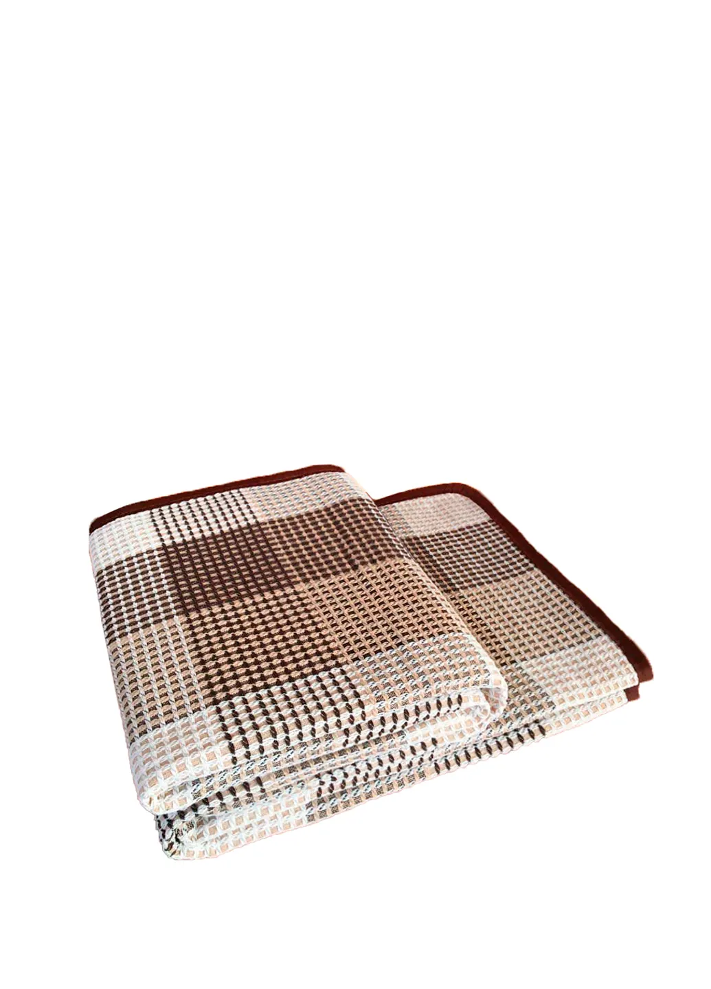 Покривало має вафельну структуру та забарвлення у вигляді квадратів різних відтінків бежевого, доповнене елегантною облямівкою. Такий дизайн відмінно доповнить будь-який інтер'єр, надаючи йому стилю та витонченості.