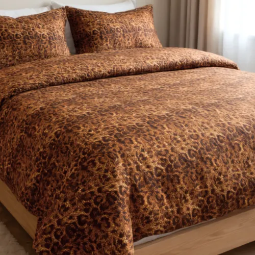Розкішний комплект постільної білизни з анімалістичним візерунком у теплих коричнево-золотистих відтінках. Тканина має делікатний блиск і ефект переливання, що додає інтер’єру глибини та елегантності.