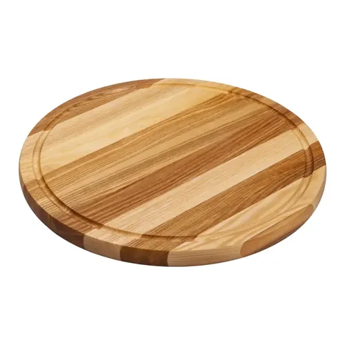 Дошка має універсальні розміри, які підходять як для щоденного приготування їжі, так і для подачі нарізки на стіл. Кругла форма з жолобком по периметру допомагає уникнути витікання рідини, що зручно при роботі з соковитими продуктами.