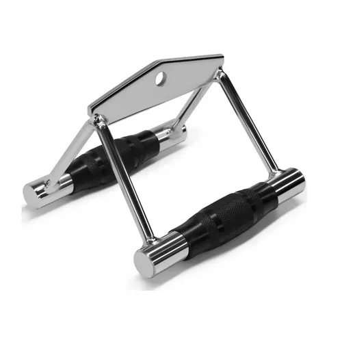 Ручка для тяги EasyFit подвійна - це надійний аксесуар для виконання тягових вправ, таких як середні та верхні тяги на блокових тренажерах, а також тяги штанги у нахилі та підтягування. Фіксований підвіс не обертається, що забезпечує стабільність під час тренувань. Поліуретанові накладки з ромбовидною текстурою гарантують надійний хват і запобігають ковзанню.