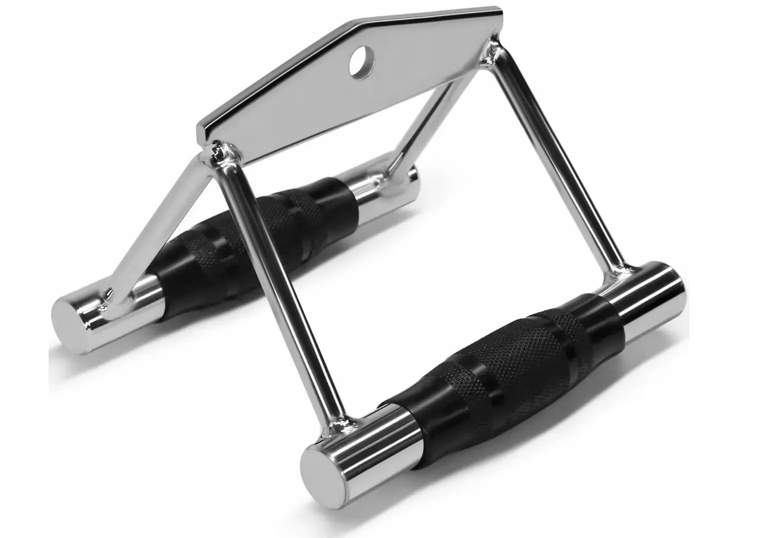 Ручка для нижньої тяги EasyFit має безліч переваг: міцний хромований метал гарантує тривалу експлуатацію, а потовщене підвісне вушко збільшує надійність під час використання. Поліуретанові накладки з ромбовидною текстурою сприяють впевненому захопленню навіть за інтенсивних тренувань.