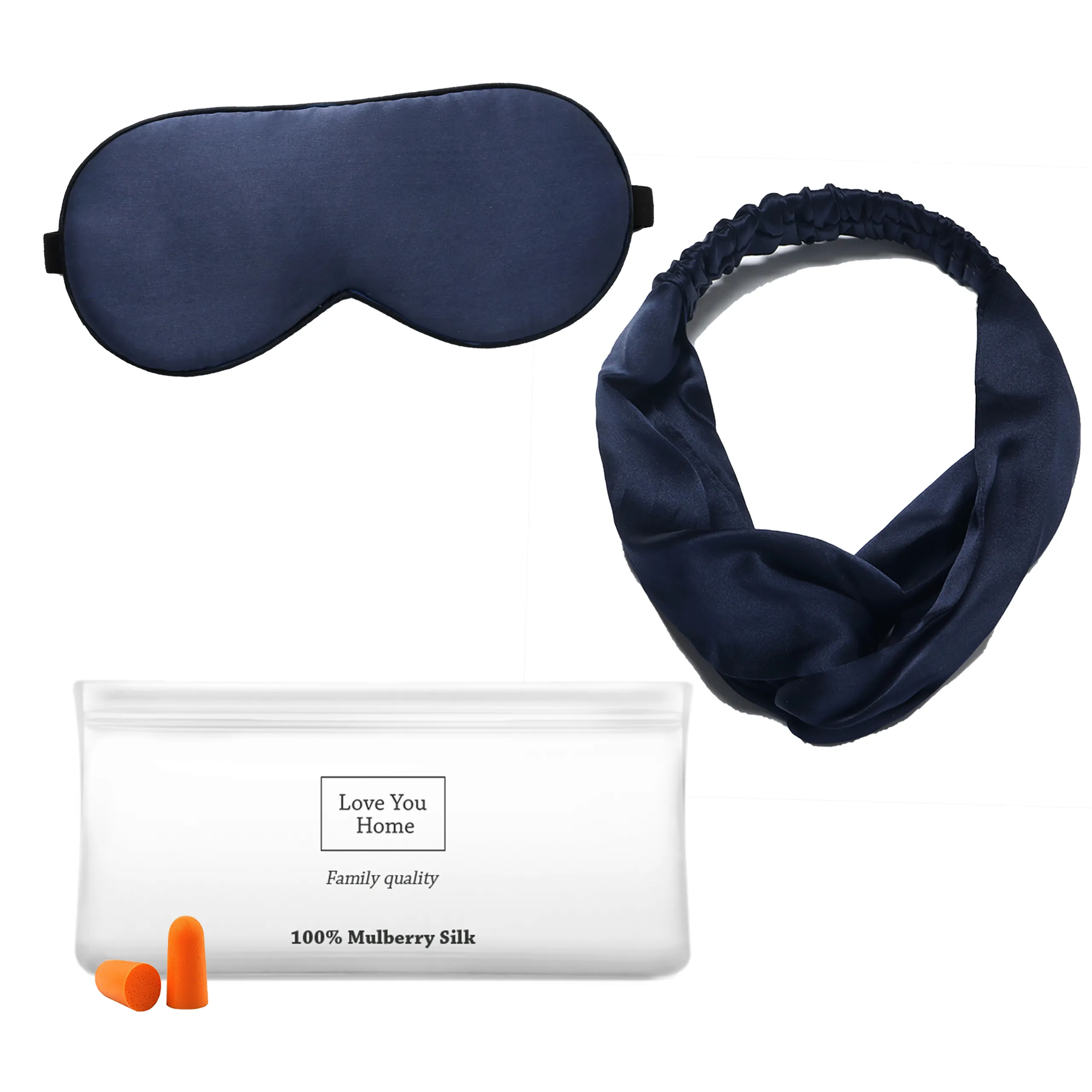Шовковий набір Маска для сну, повязка на голову, беруші та косметичка Love You Синій 100% шовк