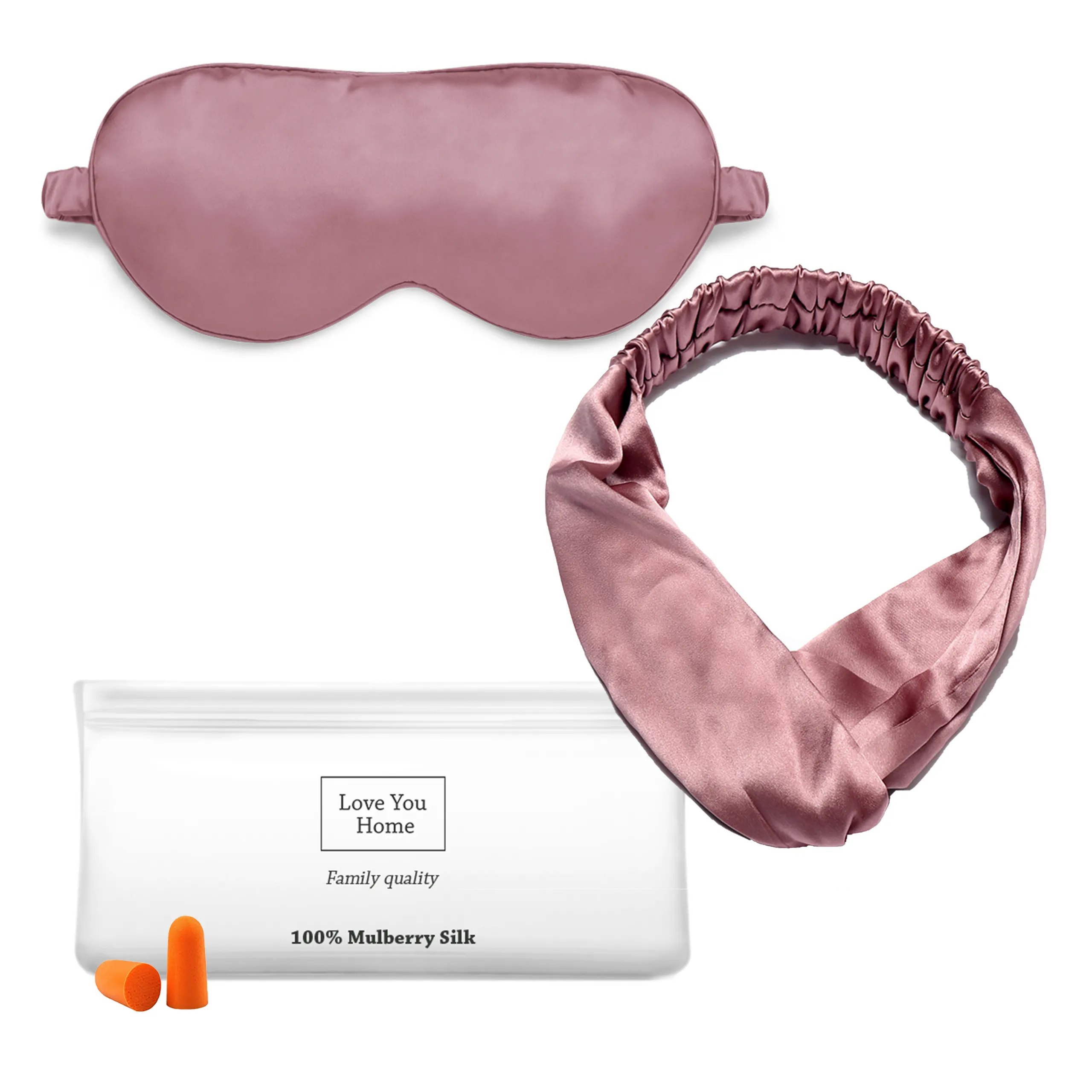 Даний набір включає шовкову маску для сну, пов'язку на голову, набір берушів і косметичку для зручного зберігання. Всі вироби виконані зі 100% натурального шовку Mulberry, що забезпечує високу якість матеріалу та комфорт при використанні. Колір комплекту — темно-рожевий, що створює приємний естетичний ефект та підходить для тих, хто цінує поєднання практичності та стилю.