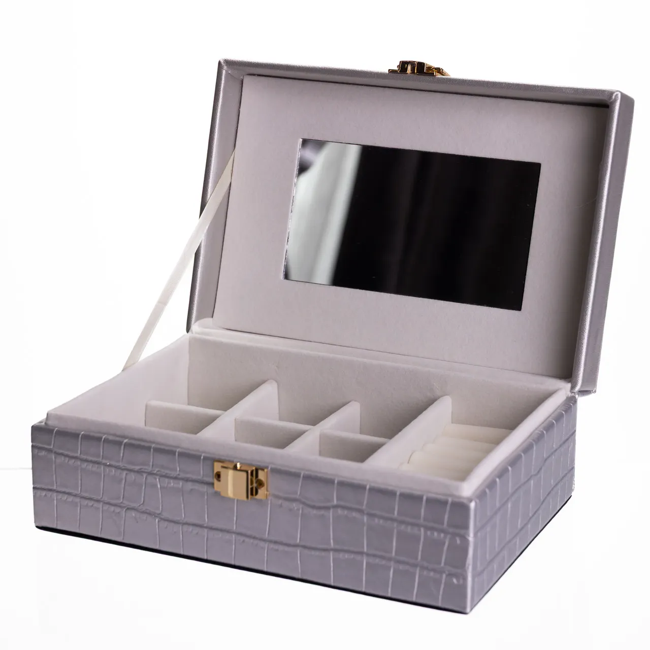 Скринька для прикрас з еко шкіри 10 відділень з дзеркалом 20×14×8 см Сірий HP-5-19G
