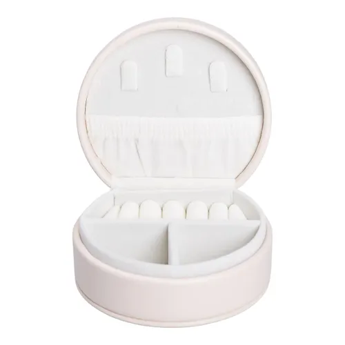 Корпус виконаний із зносостійкої екошкіри бежевого кольору з приємною фактурою. Форма скриньки кругла, що надає їй сучасного та вишуканого зовнішнього вигляду. Внутрішнє покриття з велюру гарантує ретельний захист ювелірних виробів від пошкоджень, а відсутність декоративного оформлення робить виріб стильним і універсальним під будь-який інтер'єр.