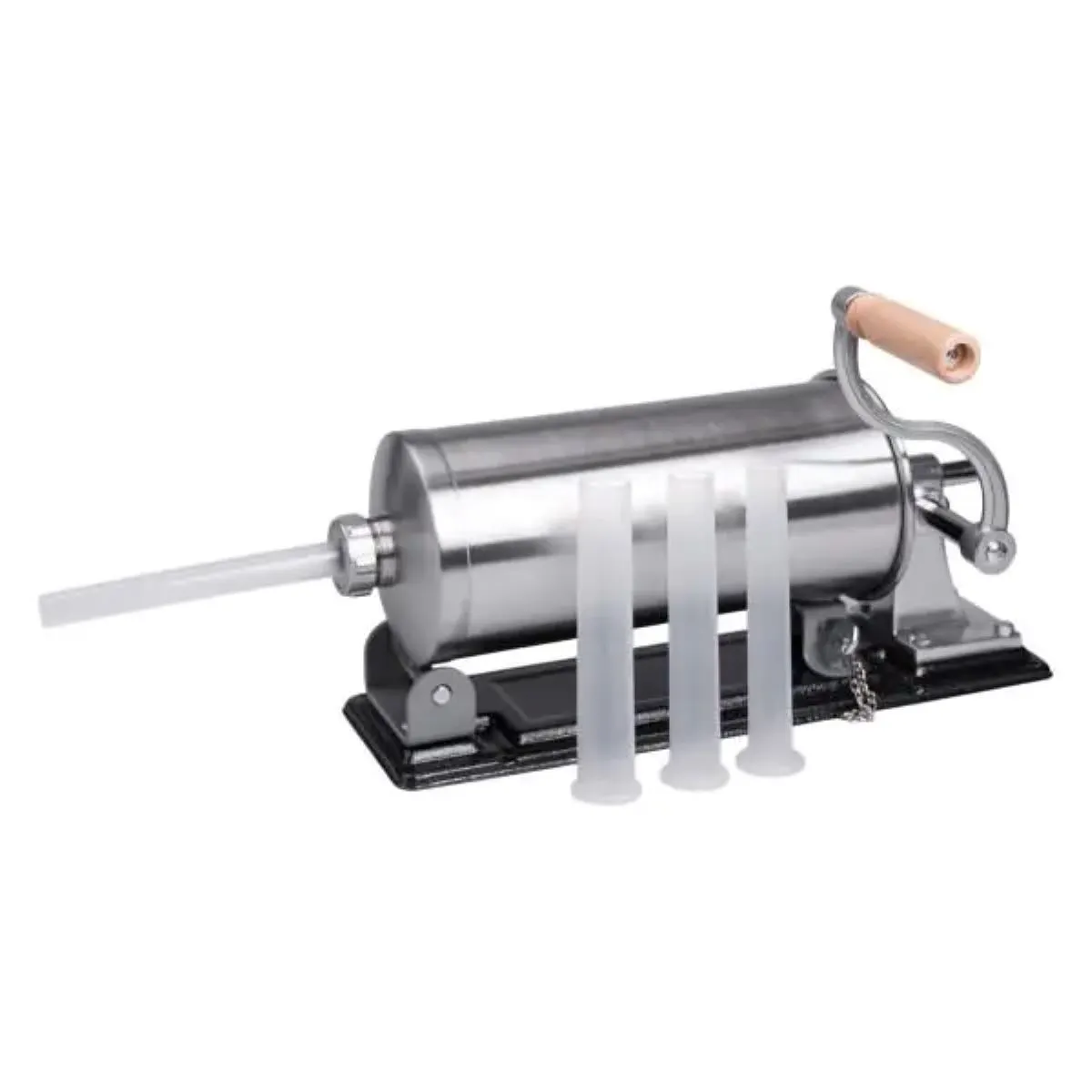 Особливістю цього пристрою є горизонтальне розташування циліндра, що полегшує процес наповнення фаршу і дозволяє контролювати його рівномірний розподіл у оболонці. Рукоятка виконана зі сполучення нержавіючої сталі та дерева, завдяки чому забезпечується зручний хват і легкість у керуванні інструментом. У комплекті передбачено чотири насадки різного діаметра (13 мм, 17 мм, 20 мм і 22 мм), що дозволяє використовувати шприц для виготовлення ковбас різного розміру й форми.
