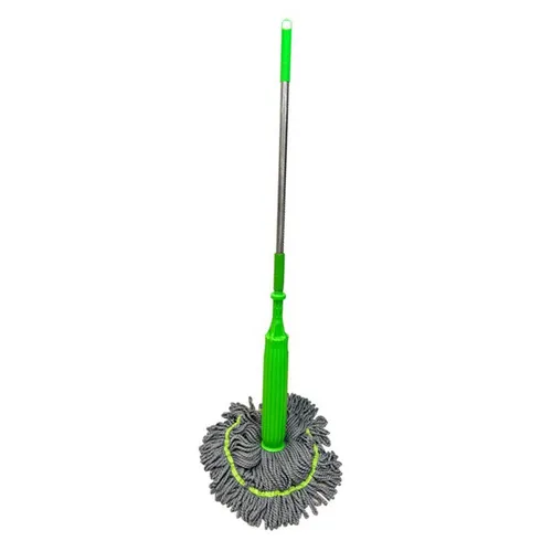Робоча частина швабри виконана з круглої насадки з мікрофібри з щільним плетінням волокон. Така форма дозволяє рівномірно розподіляти вологу по поверхні, забезпечуючи дбайливе і ретельне очищення без розводів і пошкоджень матеріалу підлоги. Насадка надійно закріплена на ручці за допомогою жорсткого пластикового кріплення, що запобігає її випадковому від'єднанню під час прибирання.
