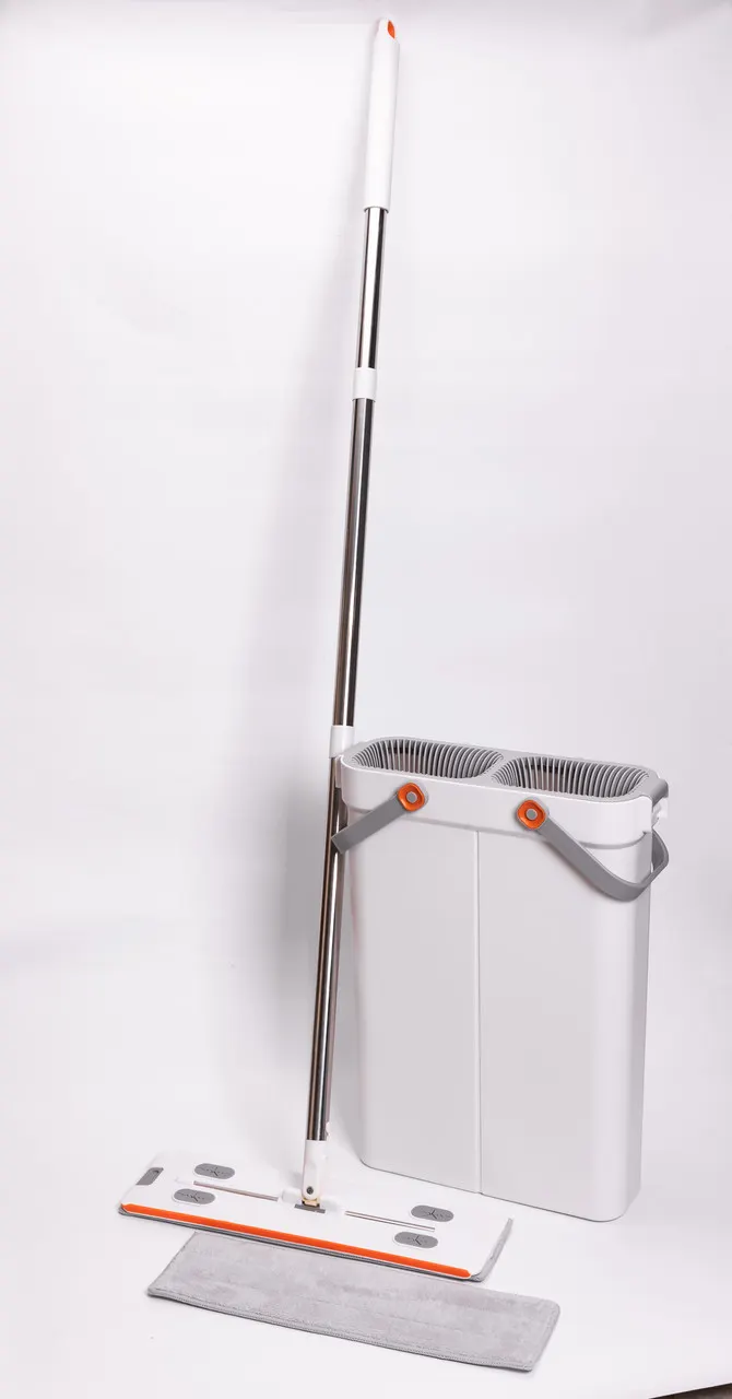 Цей набір для прибирання включає плоску швабру з мікрофібровою насадкою та відро з системою віджиму, що забезпечує зручність та ефективність вологого прибирання. Швабра оснащена міцною і стійкою платформою з чотирма протиковзкими вставками, завдяки яким інструмент надійно фіксується під час зберігання.