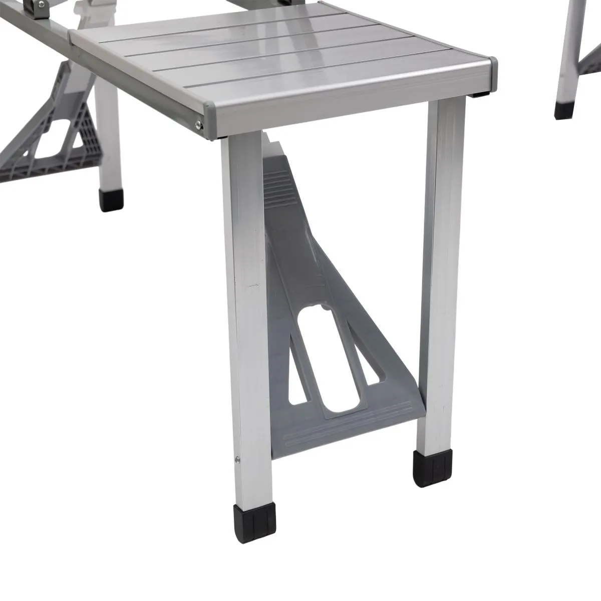 Цей туристичний комплект має кілька переваг. По-перше, він виготовлений із високоякісних матеріалів — алюмінієвий каркас відрізняється стійкістю до корозії та легкістю, а фанерна стільниця забезпечує надійну і рівну основу. По-друге, набір оснащений отвором у центрі столу для встановлення парасолі, що дозволяє захиститися від сонця і дощу під час відпочинку.