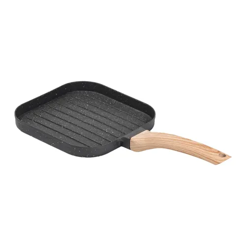 Сковорода гриль квадратна 18×18 см з рифленим дном і гранітним покриттям являє собою кухонний посуд з алюмінію з міцним антипригарним шаром. Її унікальна конструкція сприяє рівномірному розподілу тепла по всій поверхні, що забезпечує якість і рівномірність прожарювання продуктів. Рифлена поверхня створена спеціально для приготування страв у стилі гриль, створюючи характерний візерунок на м’ясі, рибі або овочах.