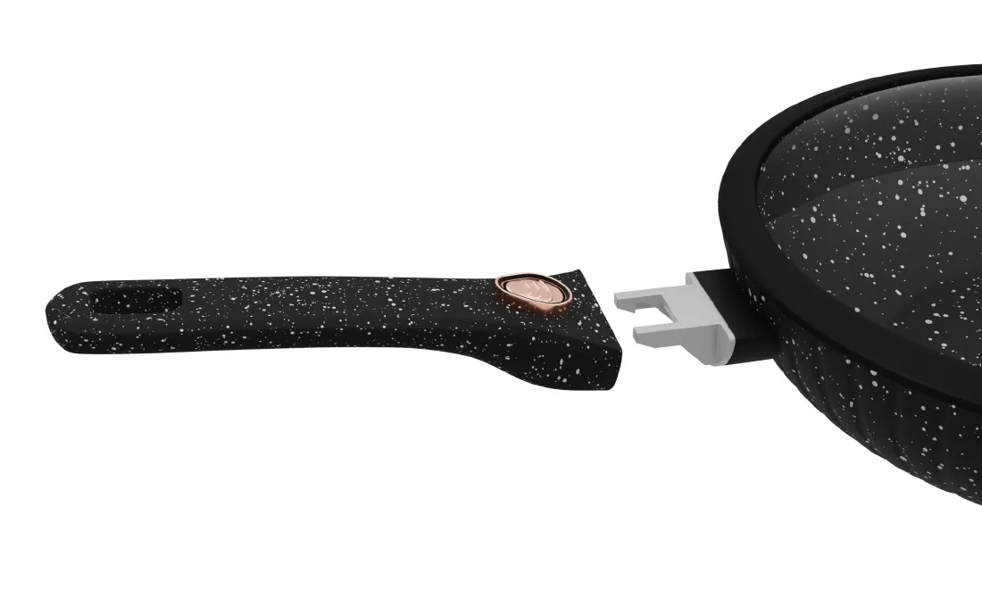 Знімна ручка з бакеліту з покриттів Soft Touch має комфорт під час експлуатації: вона не нагрівається і дуже приймається на дотик. Це робити сковороду зручною навіяти для тривалого використання.