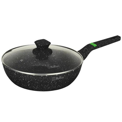 Сковорода з кришкою Bollire Venezia виготовлена з кованого алюмінію, що забезпечує легкість та міцність. Внутрішня поверхня виконана з тришаровим антипригарним зносостійким покриттям Pfluon Marble, яке розраховане на інтенсивне використання. Це покриття захищає їжу від пригорання та полегшує процес очищення.