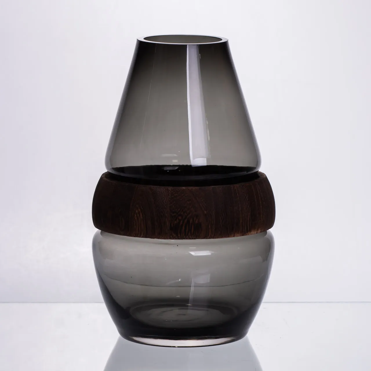 Скло, яке використовується у вазі, відзначається прозорістю та міцністю, що робить виріб довговічним і стійким до дрібних механічних впливів. Дерев'яні елементи виготовлені з натурального матеріалу з виразною текстурою, збереженою без надмірної обробки, що підсилює природну привабливість виробу.