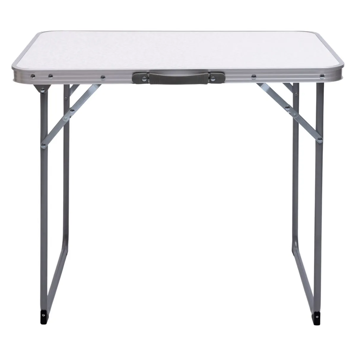 Рама виготовлена з високоякісного алюмінієвого сплаву та доповнена сталевими елементами для підвищеної стійкості та довговічності. Металеві упори фіксують ніжки у відкритому положенні, запобігаючи випадковому складанню під час використання. Ручка для перенесення та захисні накладки по краях стільниці роблять експлуатацію більш комфортною та безпечною.