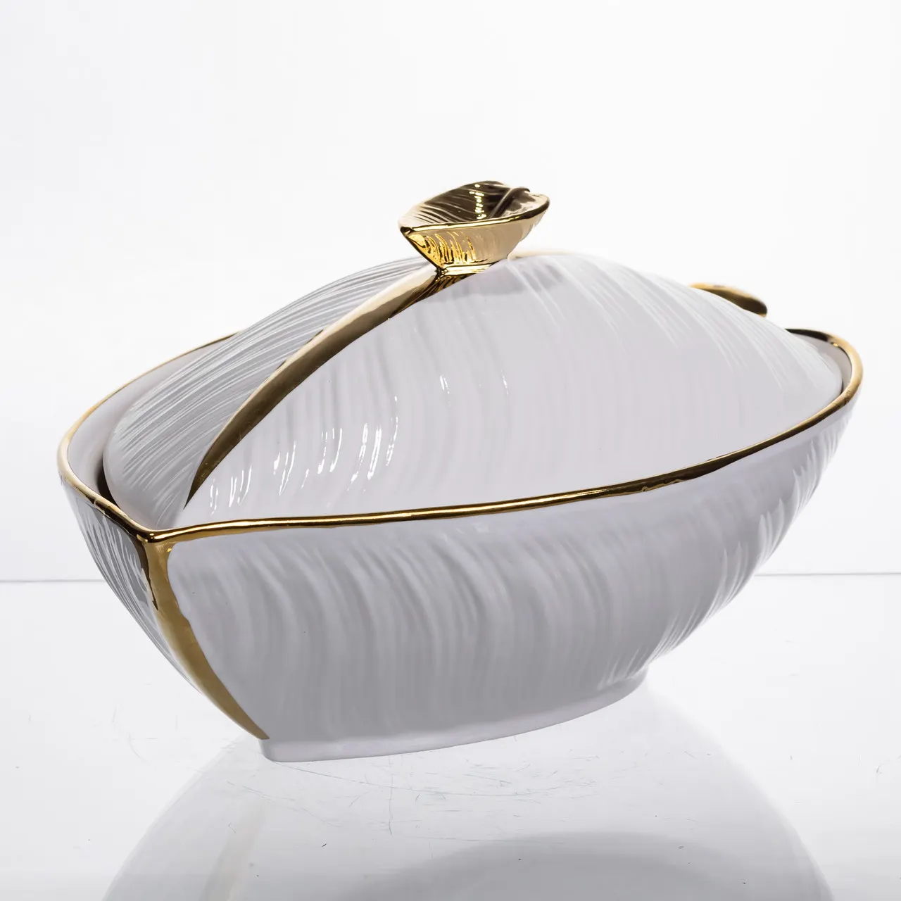 Супниця 800 (мл) порцелянова 32×21×16 (см) з кришкою Біла з золотом XL-4054AG