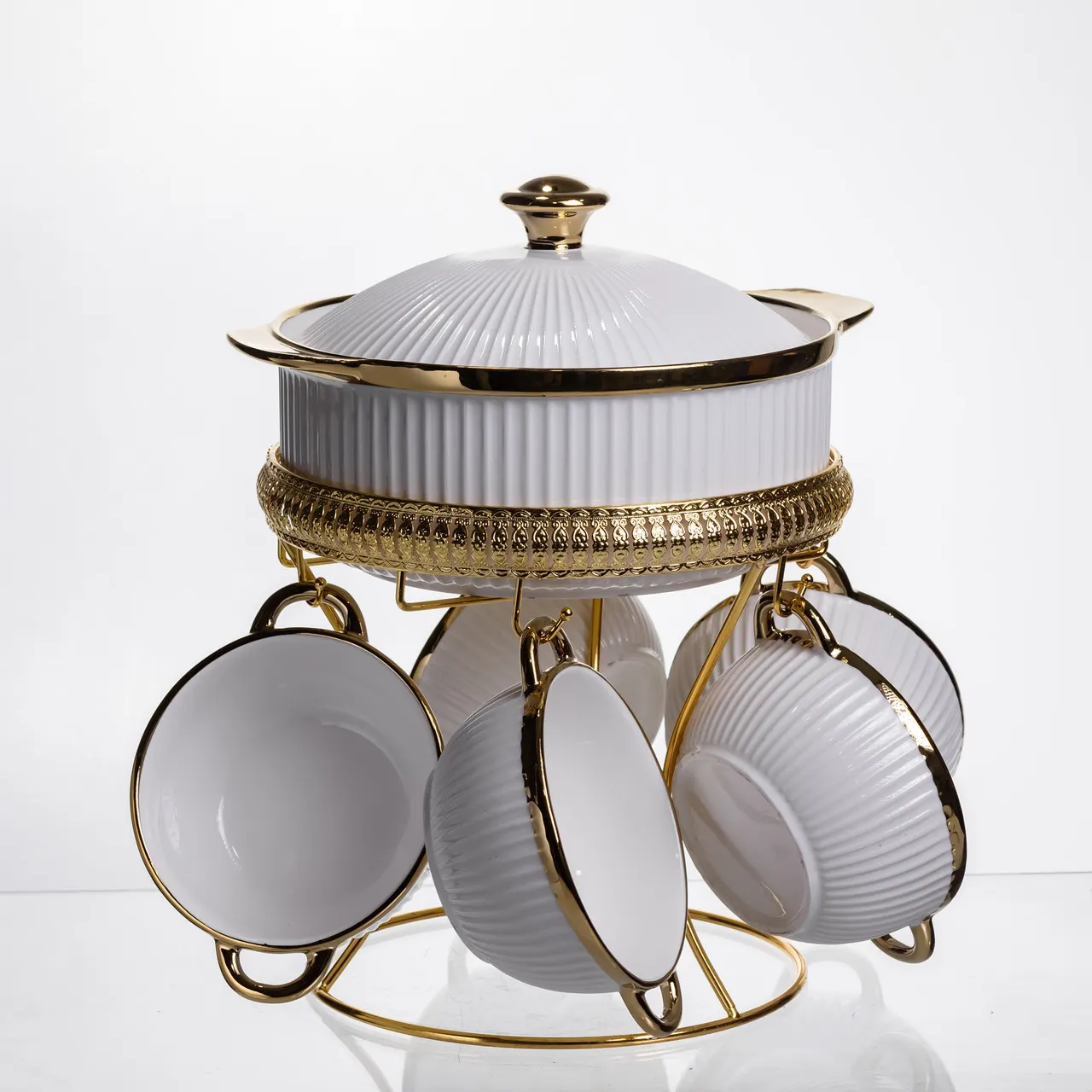 Суповий сервіз із високоякісної порцеляни стане прикрасою будь-якого столу та додасть сервіруванню нотку вишуканості. Елегантне поєднання білого кольору із золотими акцентами робить набір особливо ошатним і сучасним. До комплекту входить супниця з кришкою та п'ять супових тарілок, на міцній металевій підставці із золотим покриттям. Завдяки зручній формі та продуманому дизайну сервіз не тільки красивий, але й практичний у використанні. Основні характеристики супового сервізу: Матеріал: порцеляна + метал; Размер: 22×22×31 см; Обсяг супиці: 1.8 литра; Об'єм тарілок: 400 мл; Діаметр супниці: 21 см; Діаметр тарілок: 12см. Такий набір прекрасно підійде для сімейних обідів, святкових вечер або урочистих заходів. Він стане чудовим подарунком на весілля, новосілля або ювілей, підкреслюючи смак і увагу до деталей господарів будинку.