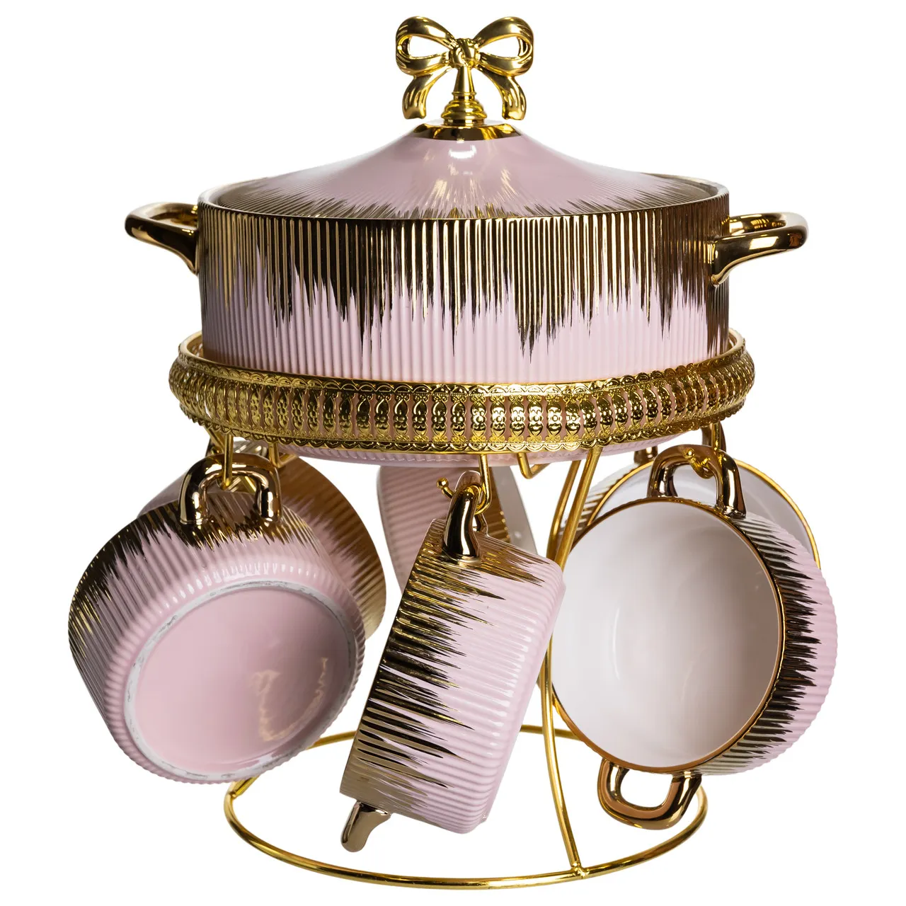 Суповий сервіз на 6 осіб включає в себе супницю об’ємом 2 літри з кришкою та шість бульйонниць по 400 мл кожна, виконані з високоякісного фарфору. Прикраса столу цим набором підкреслить вишуканість і елегантність вашої сервіровки завдяки гармонійному поєднанню рожевого кольору з золотими елементами. Металева підставка з золотим покриттям забезпечує надійність і зручність у використанні, а також додає додатковий декоративний акцент усьому комплекту.
