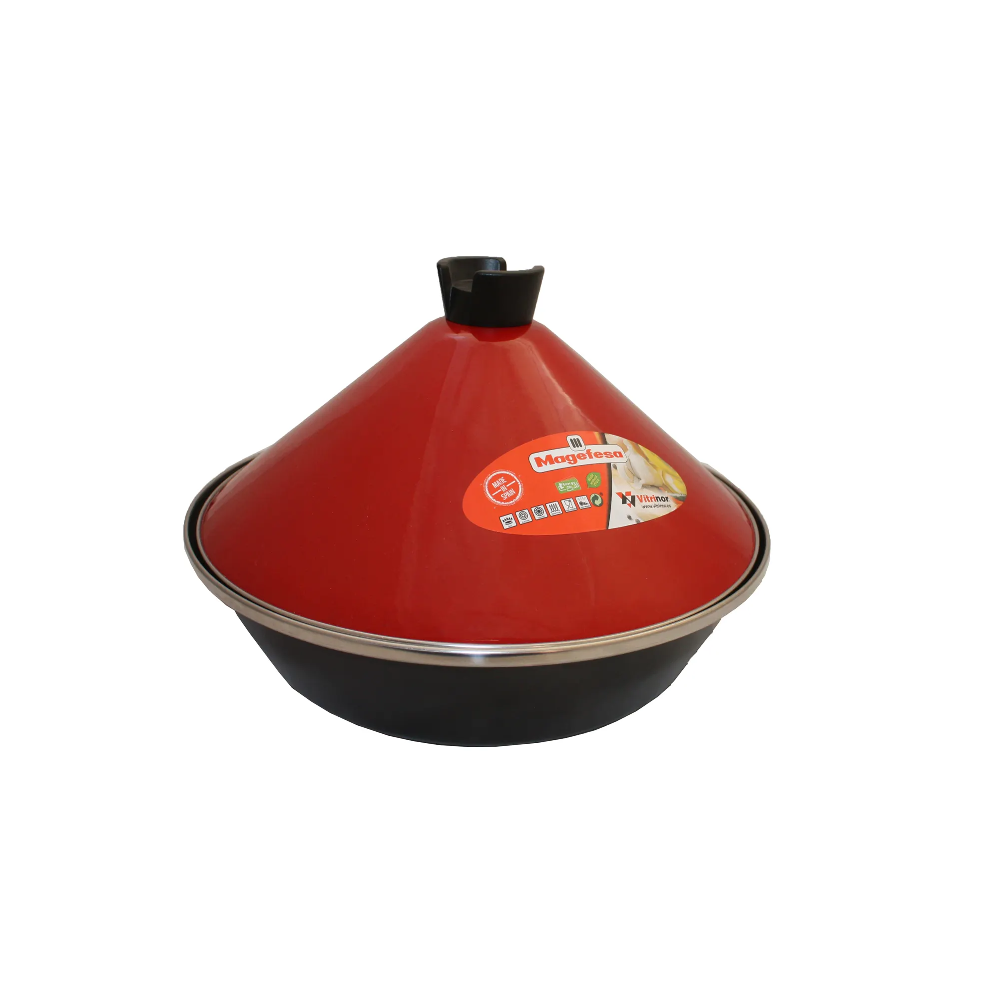 Діаметр посуду складає 26 см, що робить його універсальним для сімейних обідів та дружніх зустрічей. Виготовлений із емальованої сталі з бакелітовою кришкою, цей таджин міцний, стійкий до корозії і простий у догляді. Наявність прорізу в кришці для лопатки забезпечує зручність при приготуванні страв.