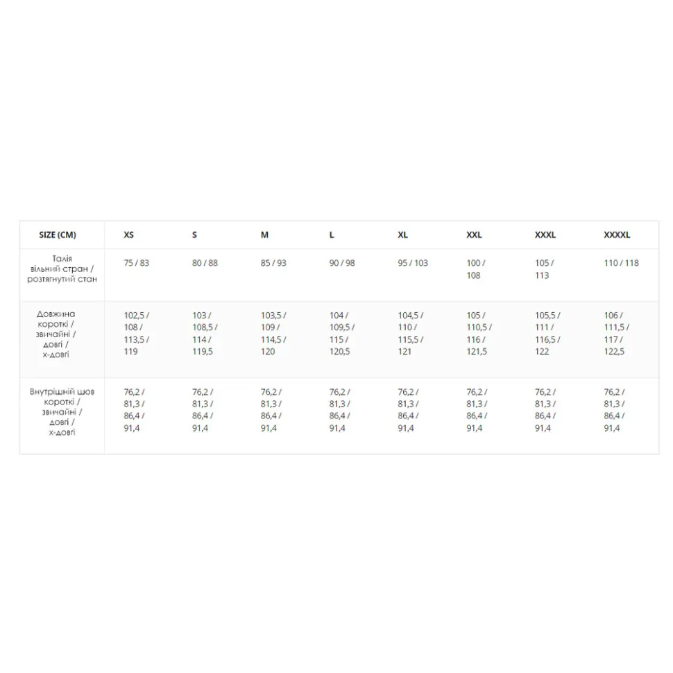 Штани доступні у розмірі XXL, що забезпечує комфортну посадку для більшості чоловіків із відповідними параметрами тіла. Рекомендується звернути увагу на таблицю розмірів виробника та врахувати можливість регулювання ширини по талії.