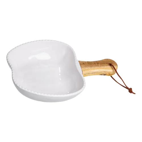 Тарілка фарфорова глибока з ручкою Яблуко 23×16×4 см являє собою поєднання функціональності та естетики, виготовлену з високоякісного фарфору та натурального дерева. Унікальна фігурна форма і білий колір роблять цю тарілку універсальним виробом для подачі різноманітних страв, від гарячих до холодних.
