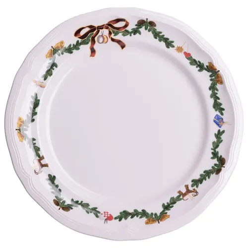 Виріб виконаний із якісної білосніжної порцеляни і має діаметр 26 см. Краї тарілки фігурні, з хвилястим рельєфом, що додає їй вишуканості та легкої вінтажної нотки. Основне декоративне оздоблення — деталізований розпис, що зображує різдвяний вінок, складений із хвойних гілок, святкових іграшок і червоно-коричневої стрічки.