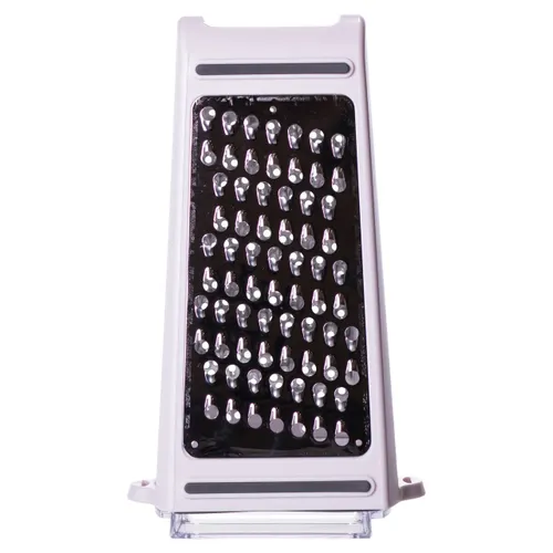 Відповідь: Контейнер виготовлений із якісного пластику і кріпиться щільно до основи терки, що запобігає його зміщенню під час натирання.