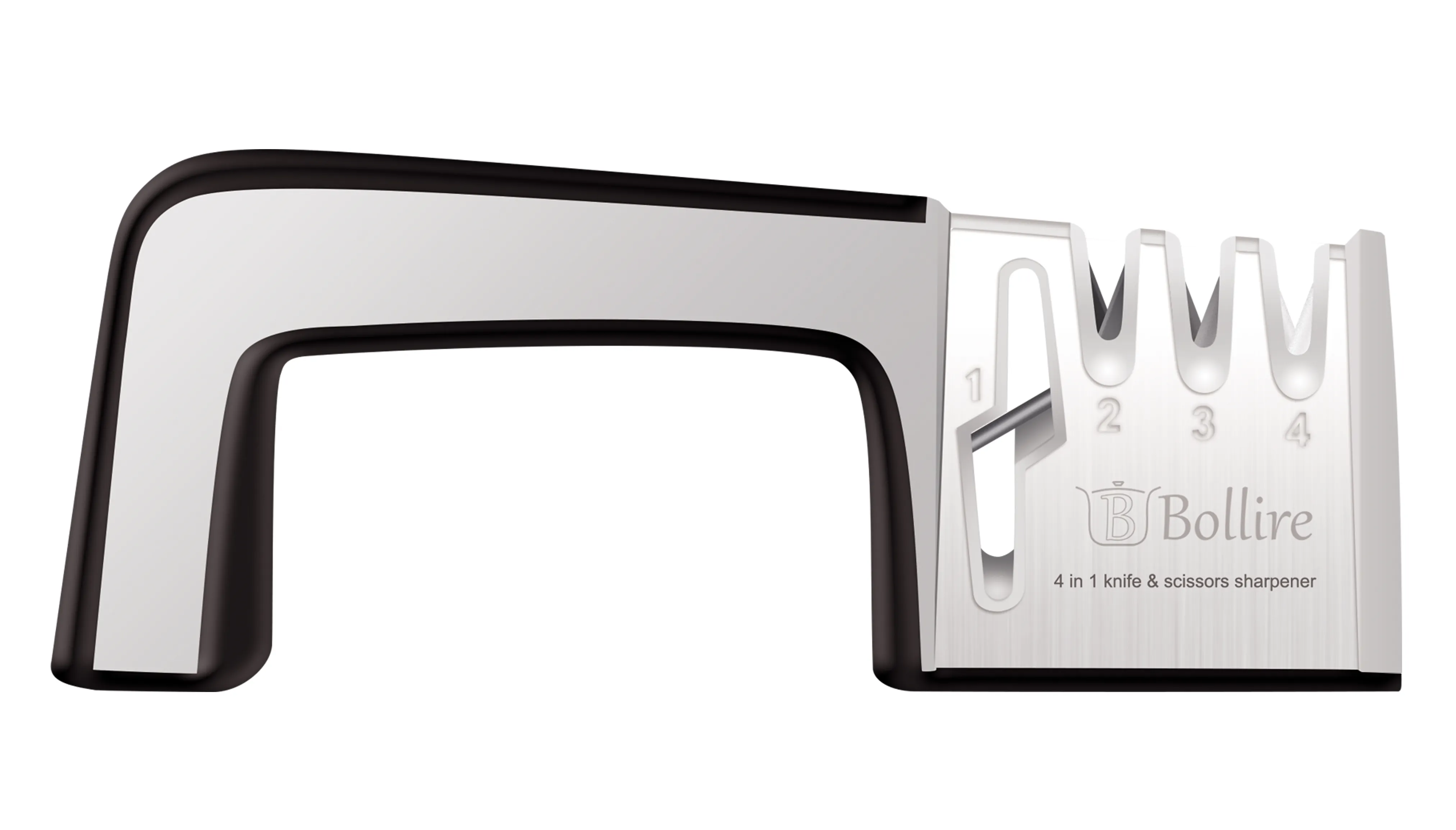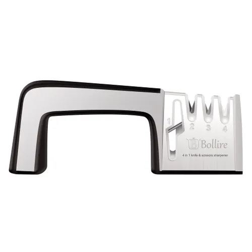 Точило BR-3711 BOLLIRE оснащено чотирма слотами для різних типів заточування. Перший слот призначений для заточки ножиць, що значно полегшує догляд за цим поширеним кухонним інструментом. Другий слот підходить для ножів із твердих марок сталі, гарантуючи відновлення гостроти навіть у зношених лез.