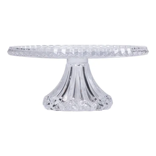 Тортівниця на ніжці HP-19-138 виконана з прозорого скла з імітацією кришталевого візерунка, що створює ефект променистого сяйва. Завдяки круглій формі з рельєфним краєм та гладкій поверхні по центру виріб ідеально підходить для презентації тортів, пирогів, капкейків та інших кондитерських виробів.