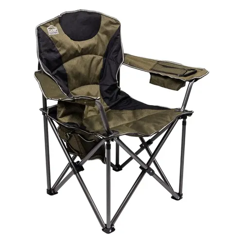 Ергономічний дизайн доповнений м’якими підлокітниками, які сприяють правильній підтримці спини та розслабленню м’язів. Високоякісні матеріали – міцна металева рама та тканина Оксфорд для сидіння та спинки – гарантують надійність та довговічність конструкції навіть при експлуатації на складних поверхнях.