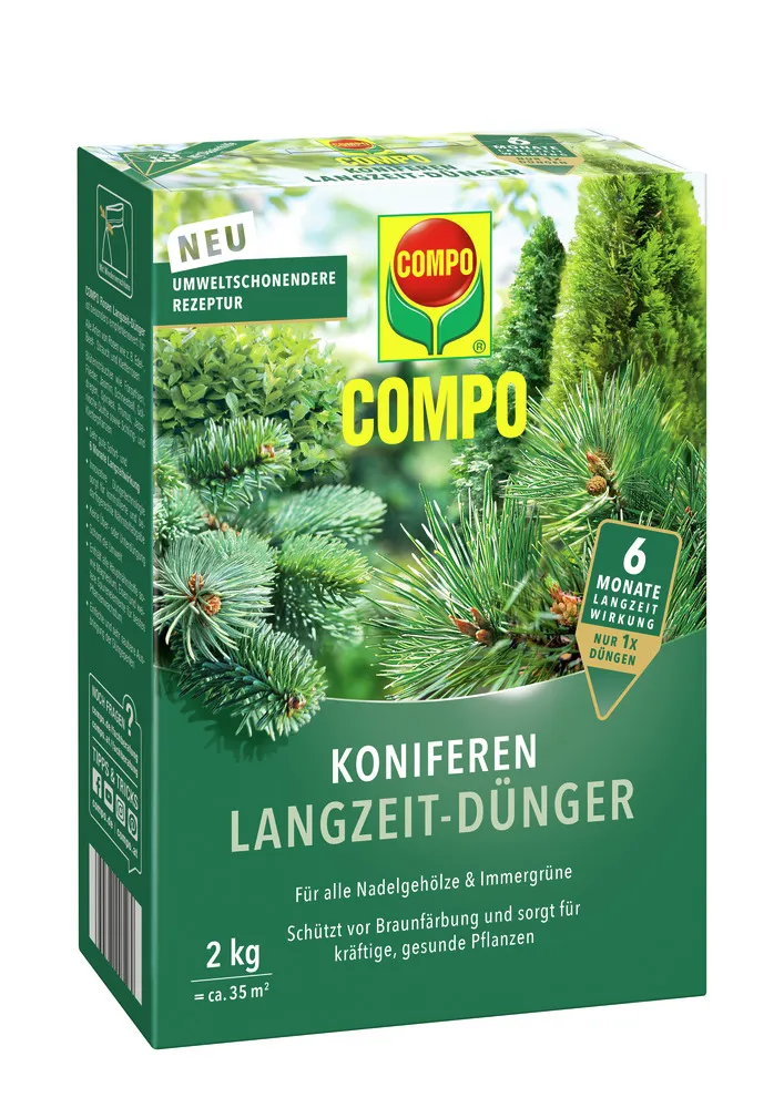 Тверде добриво COMPO придатне для підживлення всіх видів хвойних порід, включаючи ялицю, ялинку, тис, модрину, ялівець, сосну, кипарис та кедр. Також воно ідеальне для вічнозелених чагарників.
