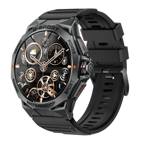 Дисплей пристрою електронний, з інформативним циферблатом, який відображає не лише час (години, хвилини, секунди), але й додаткові дані: дату, день тижня, місяць, погоду та рівень заряду акумулятора. Стиль пристрою можна описати як спортивно-армійський з елементами casual, що робить годинник універсальним аксесуаром, який підходить для різних ситуацій — від тренувань до щоденного використання.